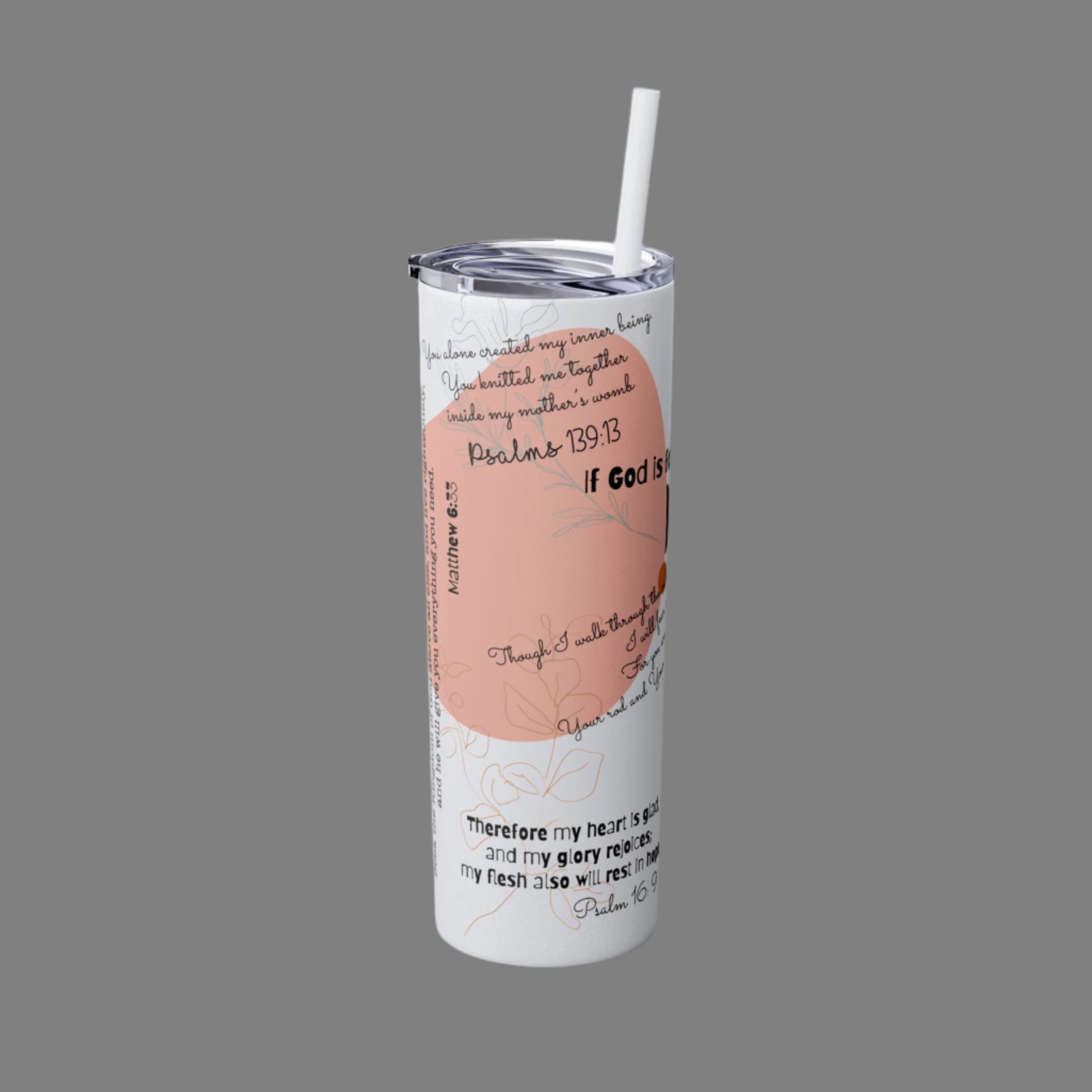 The Bible Verse tumbler is perfect for daily use for your hot or cold drinks. Hot drinks stay warm for up to 12 hours (depending on weather conditions) and cold drinks stay cold for up to 20 hours (depending on weather conditions). Give it as a gift or keep it for yourself! Perfect for keeping yourself reminded of God's great power. Our premium 20oz skinny tumbler with straw comes with a glitter iceberg base and matching straw. If you’re interested in a different color please reach out as we will be able to customize the tumbler for you at no extra charge.