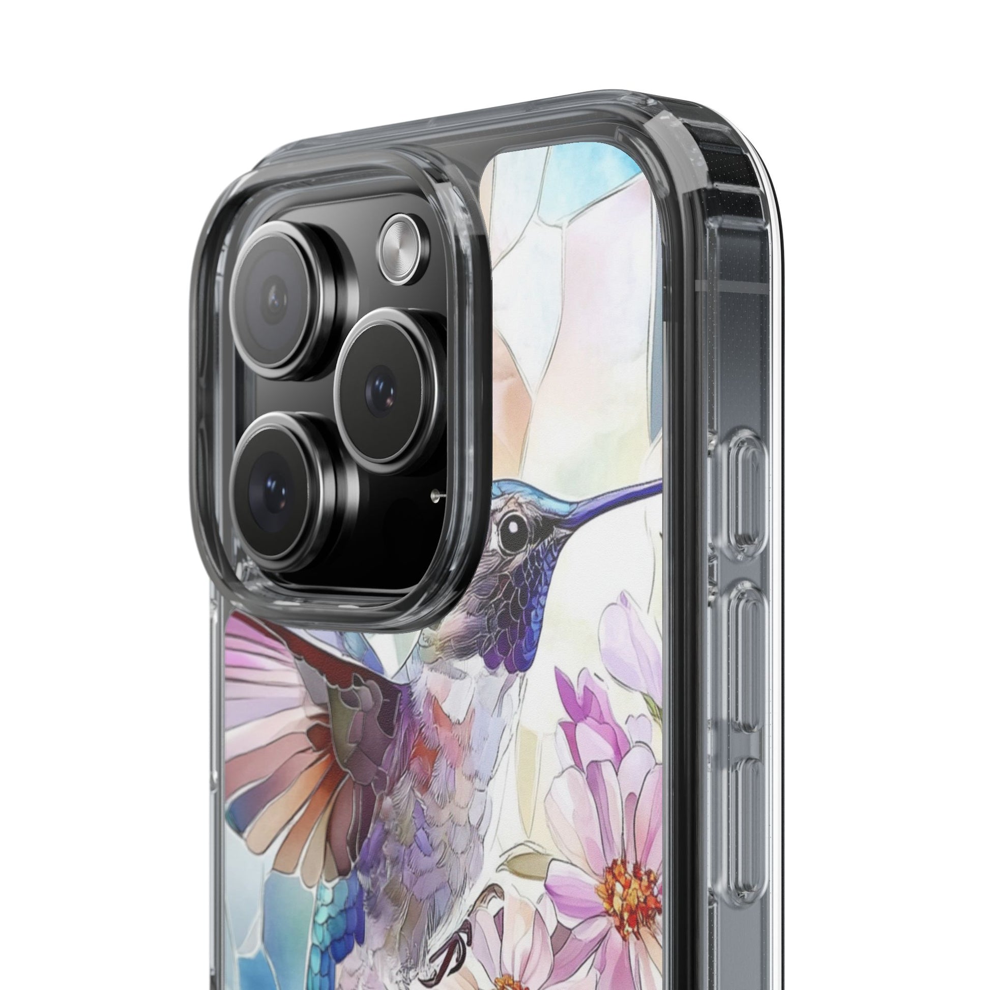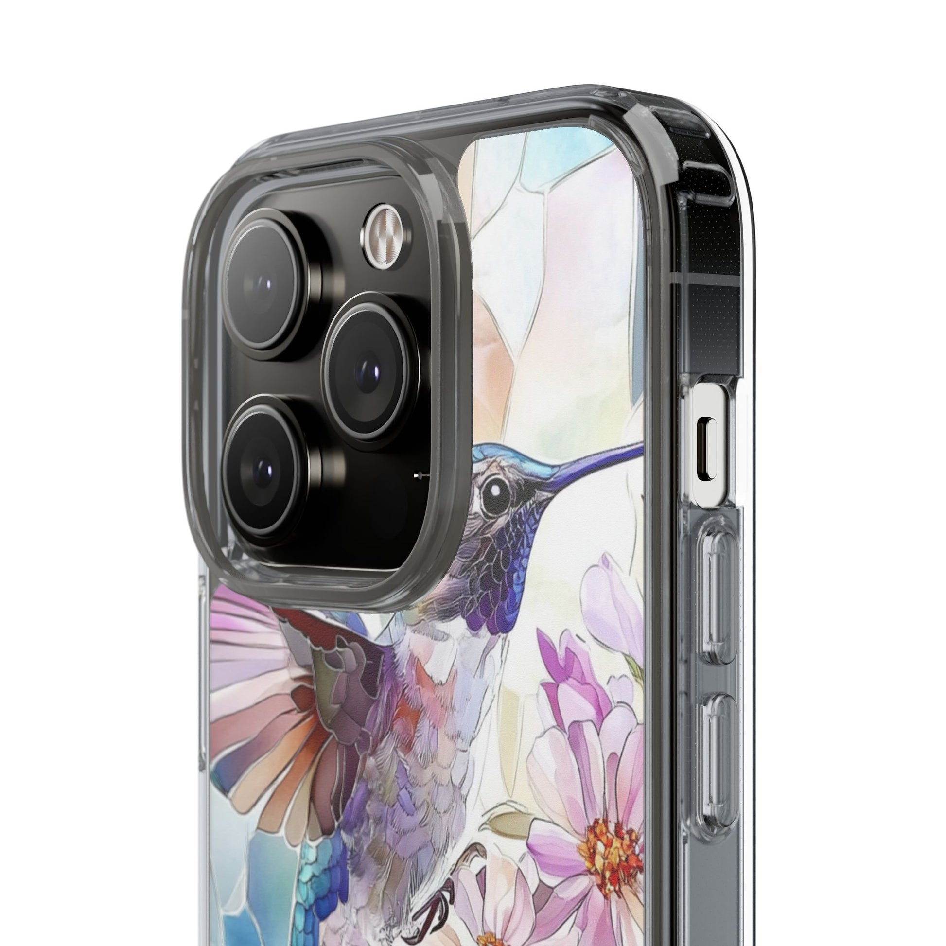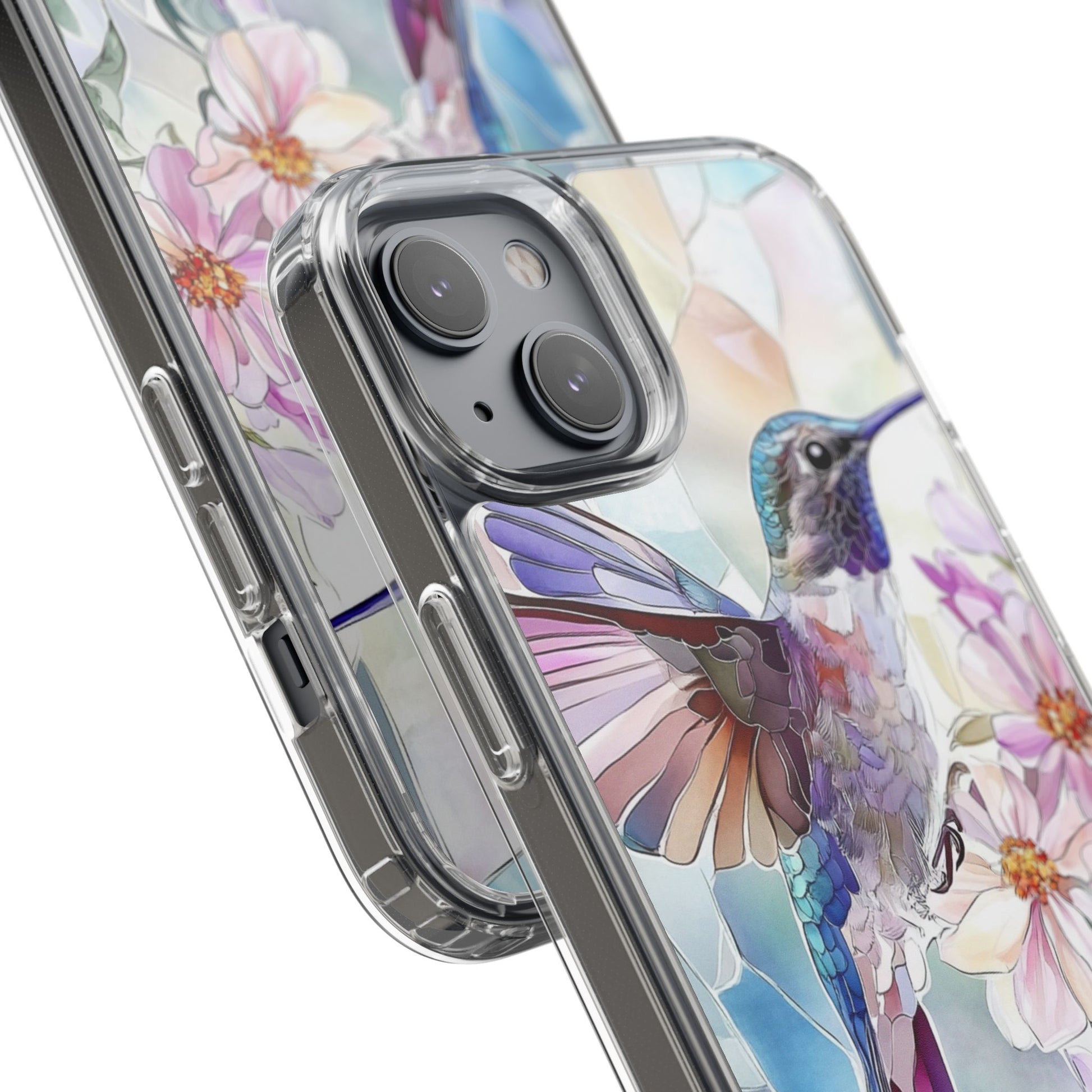 Clear Hummingbird Phone Case - Floral Stained Glass Design, Wireless Charging Compatible