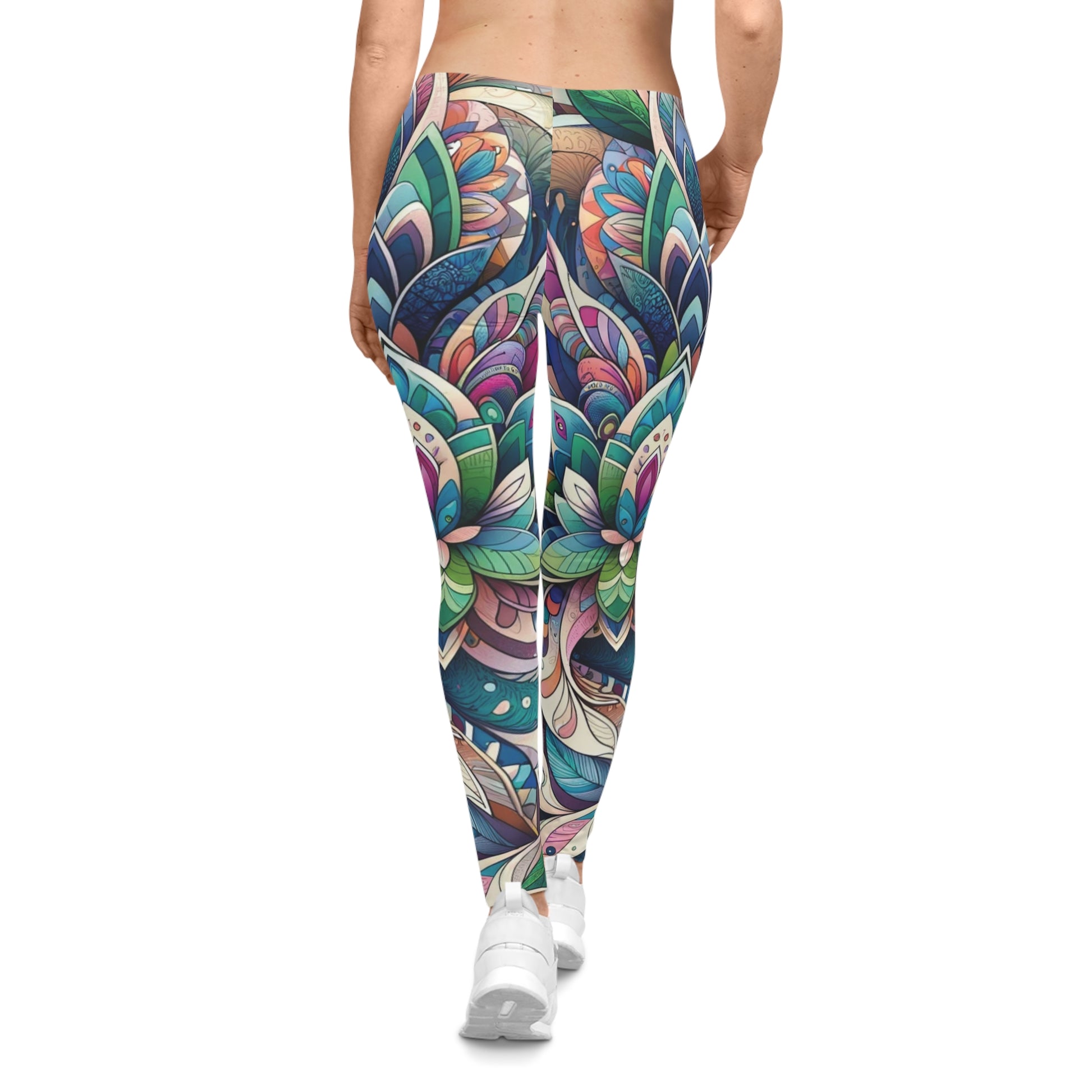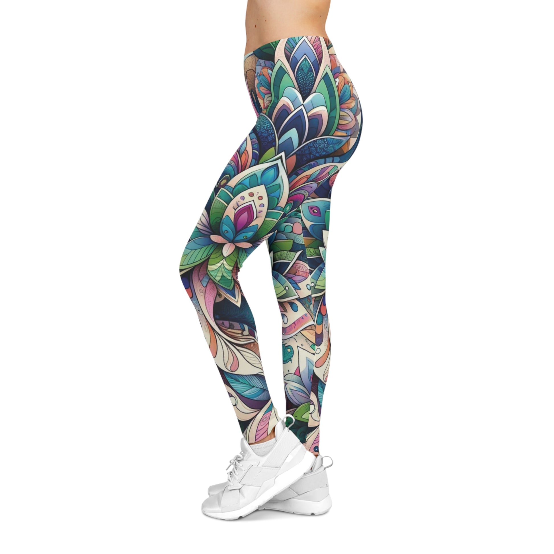 Step into a world of color with these Vibrant Boho Garden Leggings. These aren't your average yoga pants; they feature a stunning, all-over abstract print that blends swirling florals, mandala-inspired leaves, and intricate geometric shapes in rich shades of teal, pink, cream, and green.