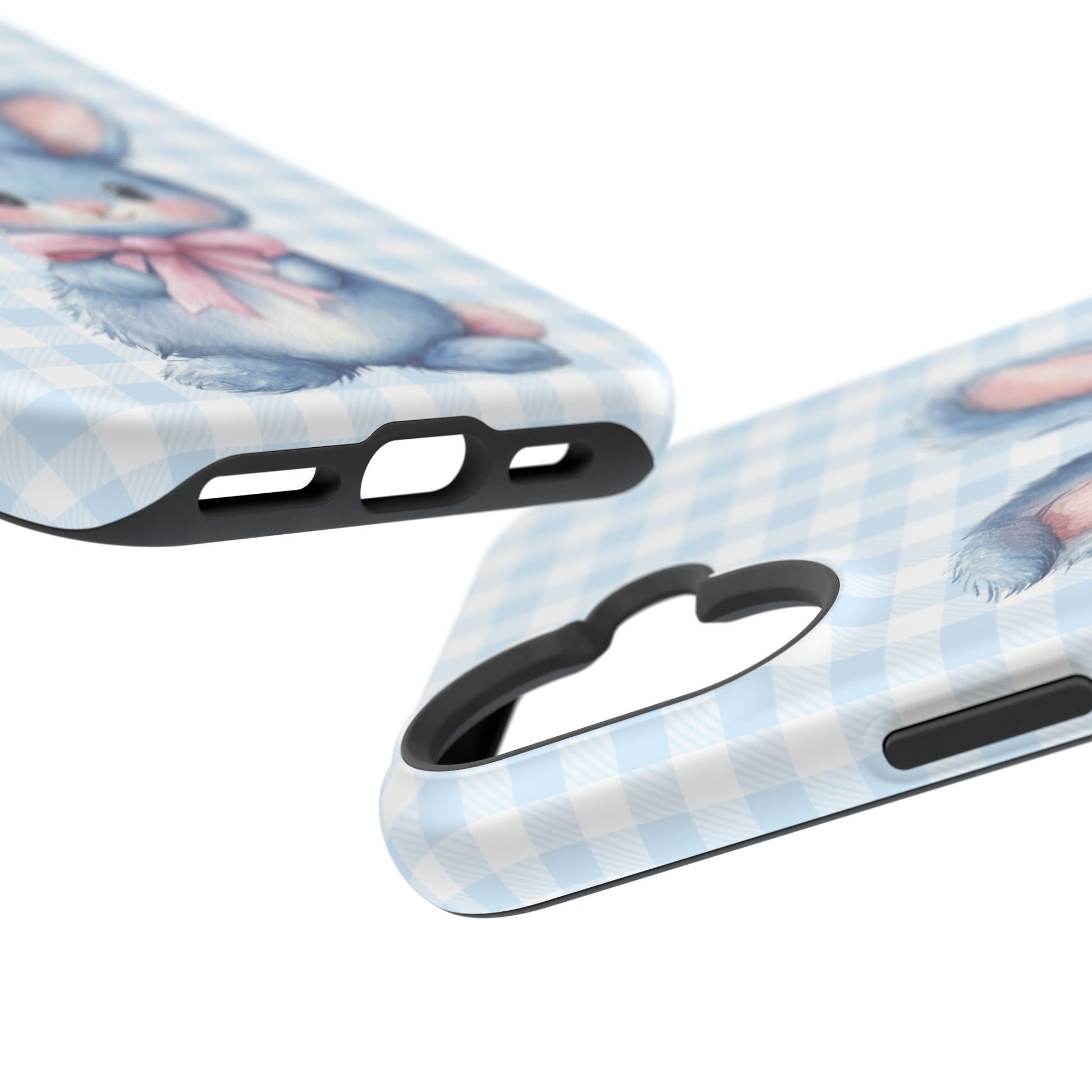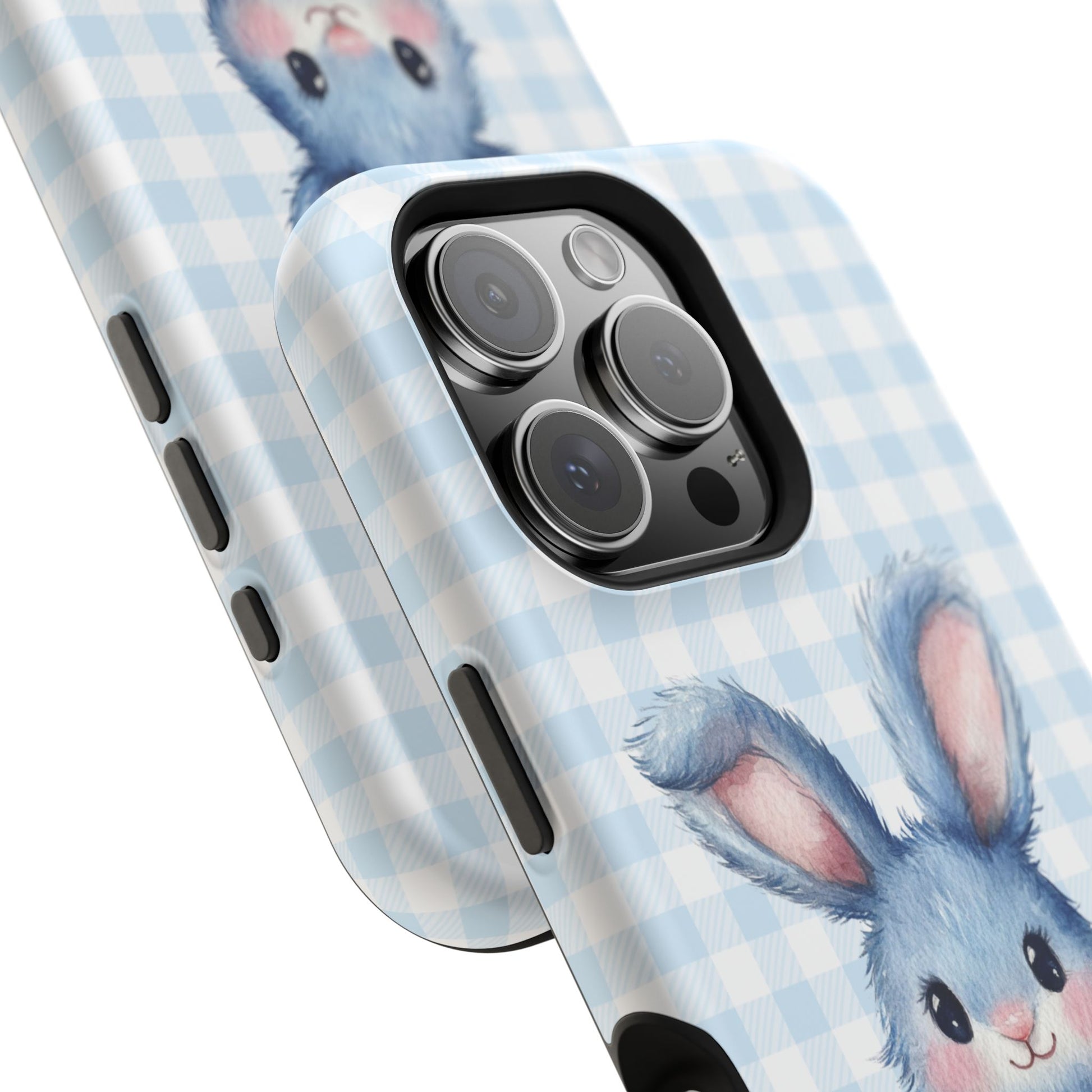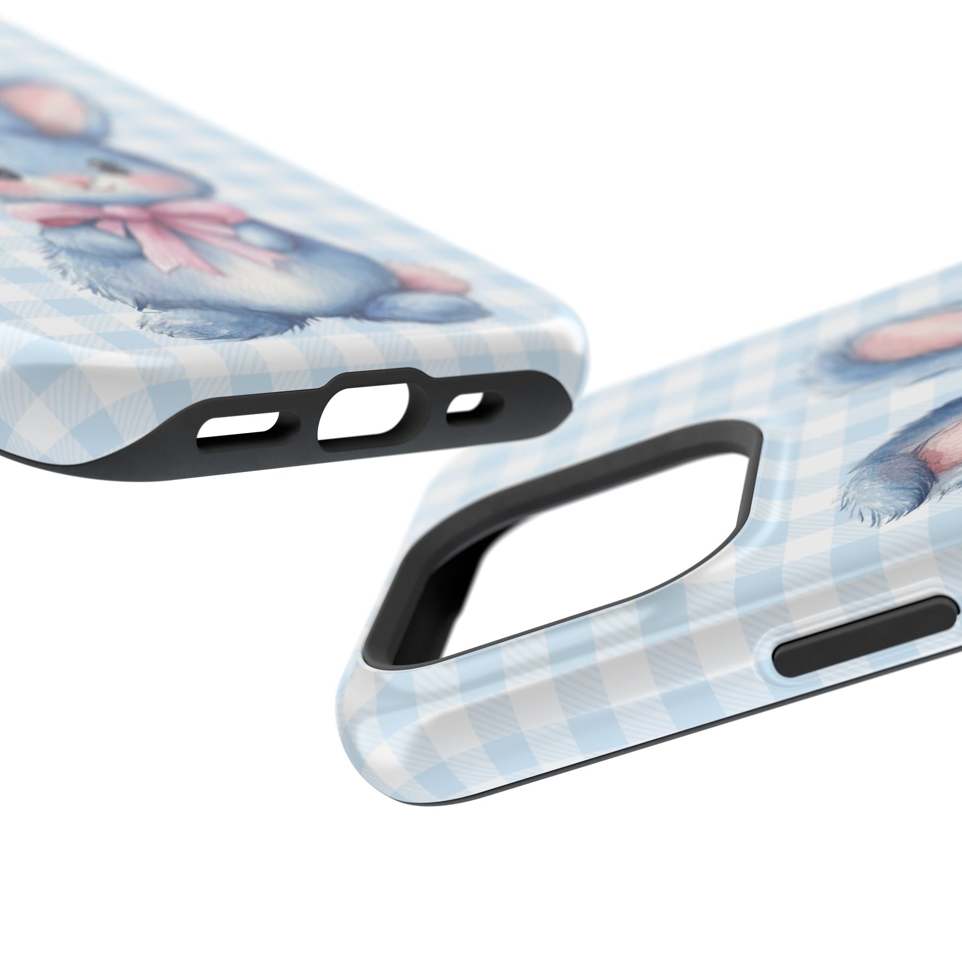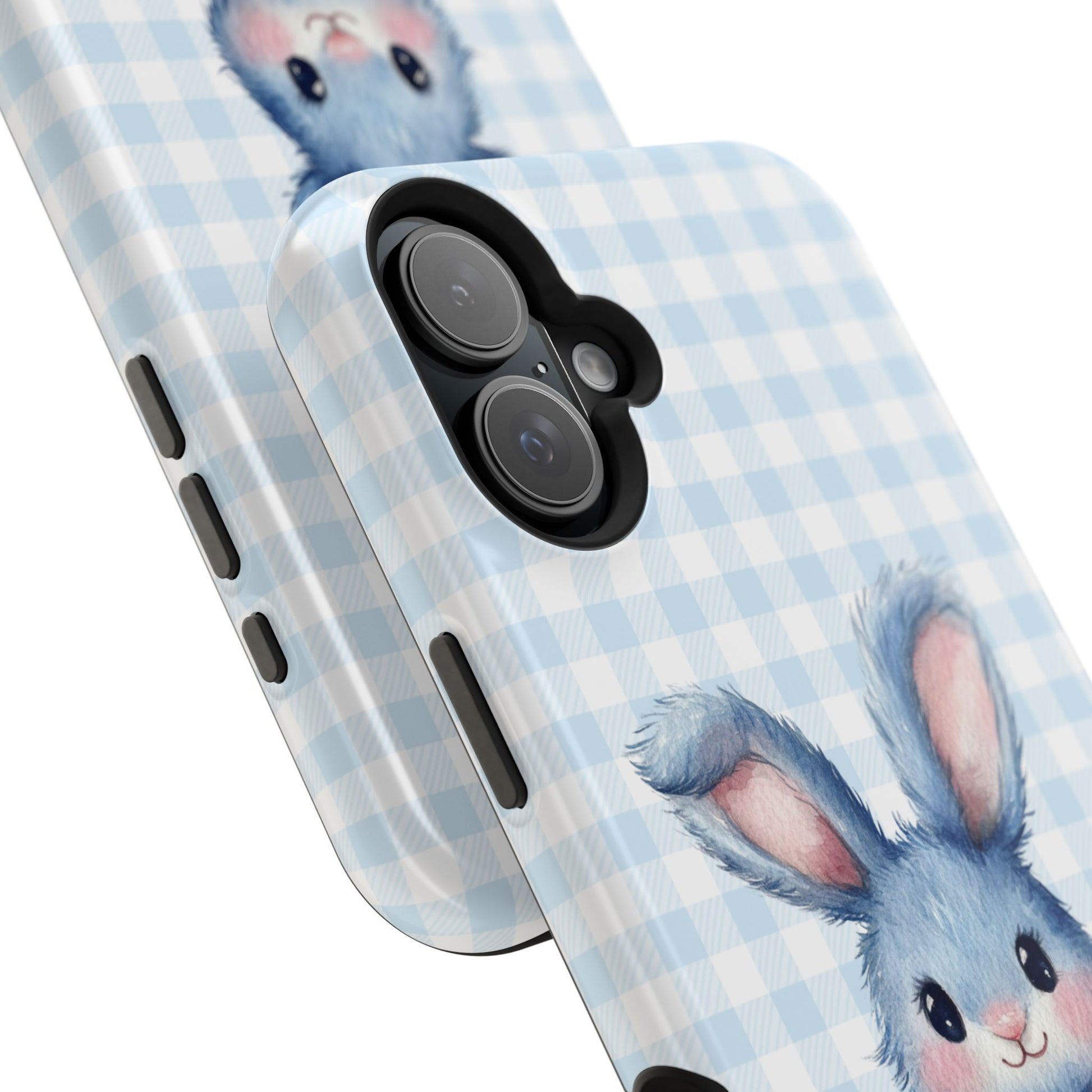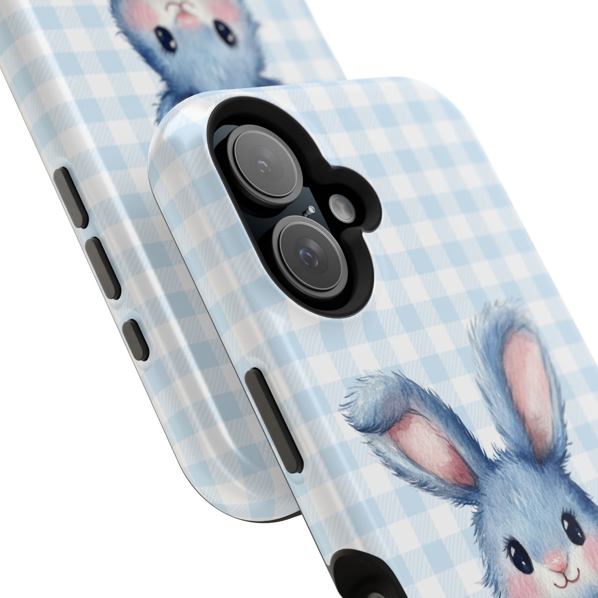 Bring a touch of charm and protection to your phone with this adorable bunny-themed iPhone magnetic tough case. Featuring a soft, blue gingham background and a sweet watercolor bunny with a pink bow, this case is the perfect blend of style and functionality. Whether you choose a matte or glossy finish, you'll love the vibrant, full-wrap design that covers every edge. Beyond its playful look, this case is built for superior protection. Its dual-layer construction, with a hard polycarbonate shell and a black TPU lining, ensures your phone is safe from drops and impacts. Plus, it's equipped with an embedded magnet, enhancing compatibility with MagSafe® accessories for easy charging and attachment. Features: Dual-layer case for extra durability and impact protection.