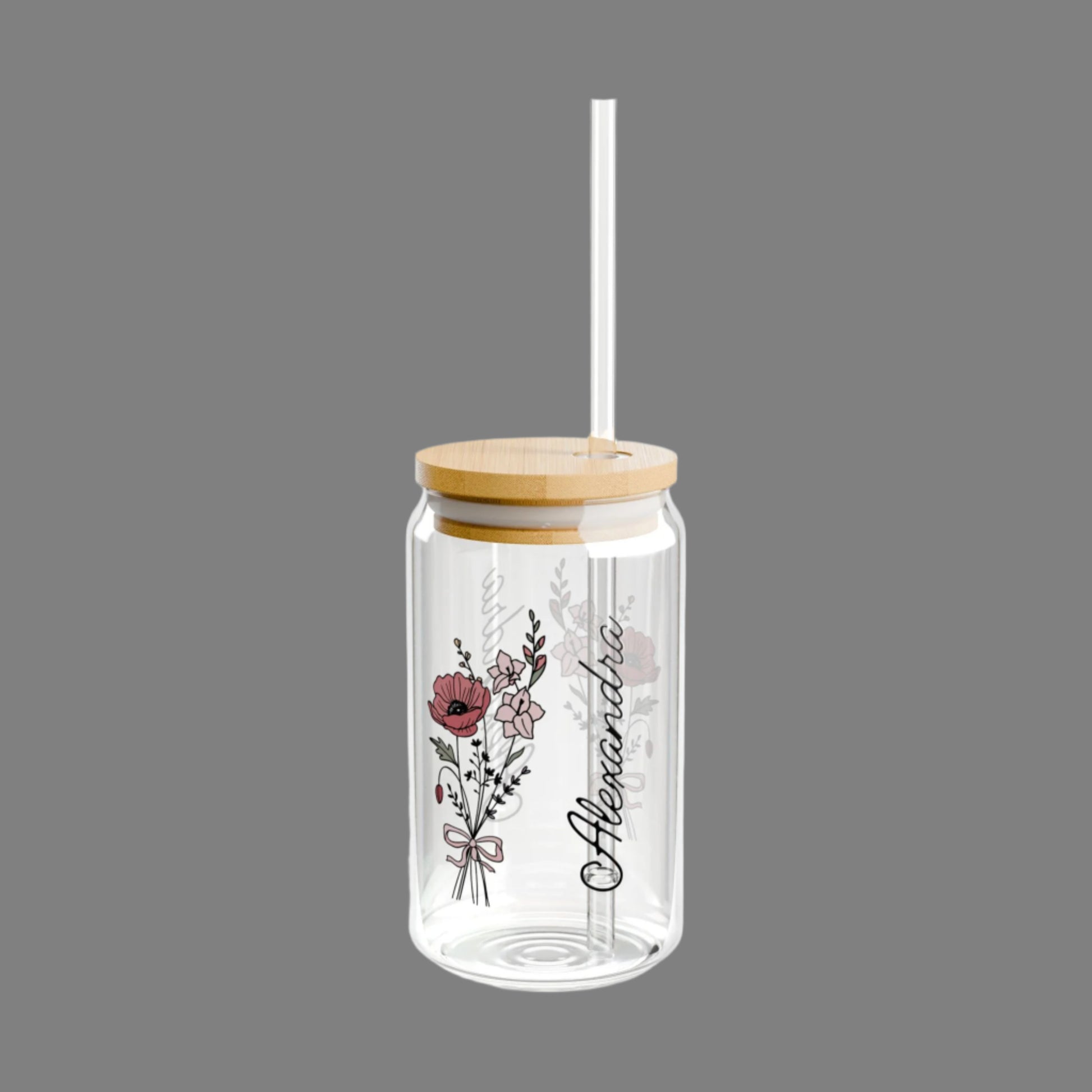 Celebrate your unique style and birth month with this Personalized 16oz Can Glass, featuring a beautifully illustrated flower for your birth month and a custom name for a personal touch. Perfect for sipping iced coffee, tea, or your favorite beverage, this glass combines elegance with functionality.