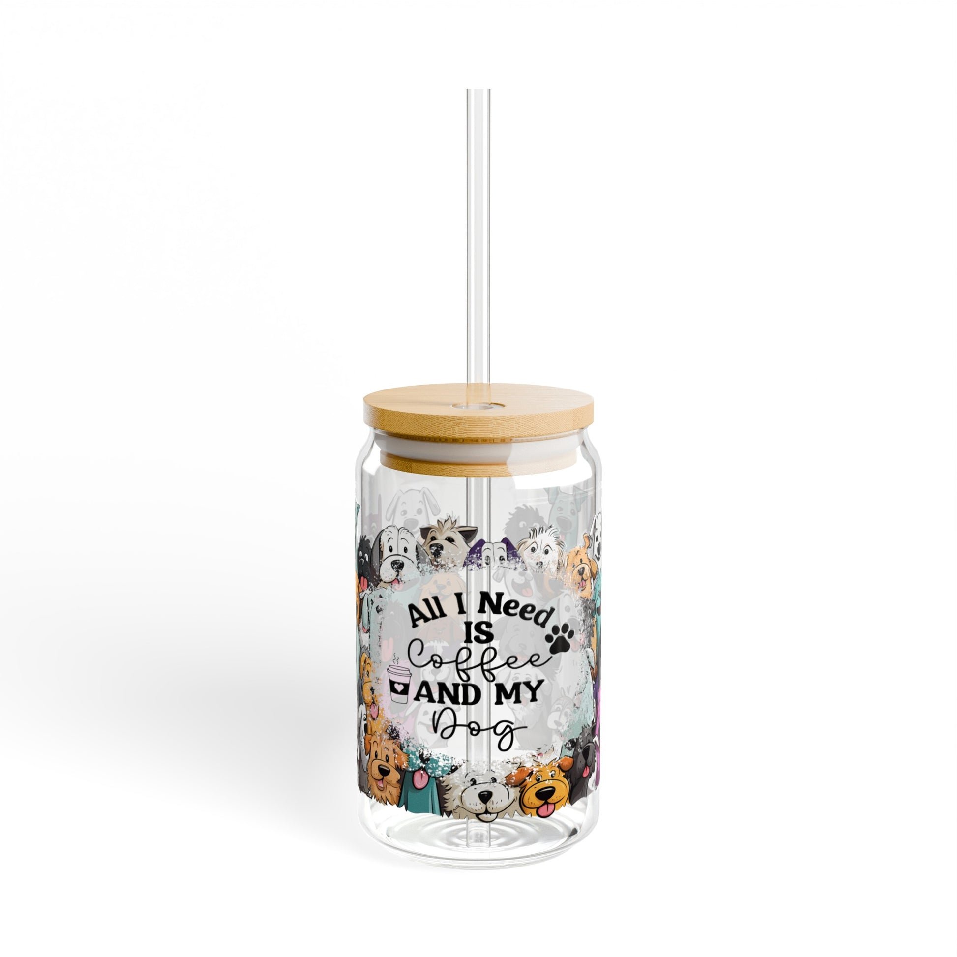Iced Coffee and Dogs 16oz Glass, Iced Coffee Can Glass, Dog Lover Cup, Glass Jar with Lid and Straw, 16oz Glass Cup, Libbey Cup