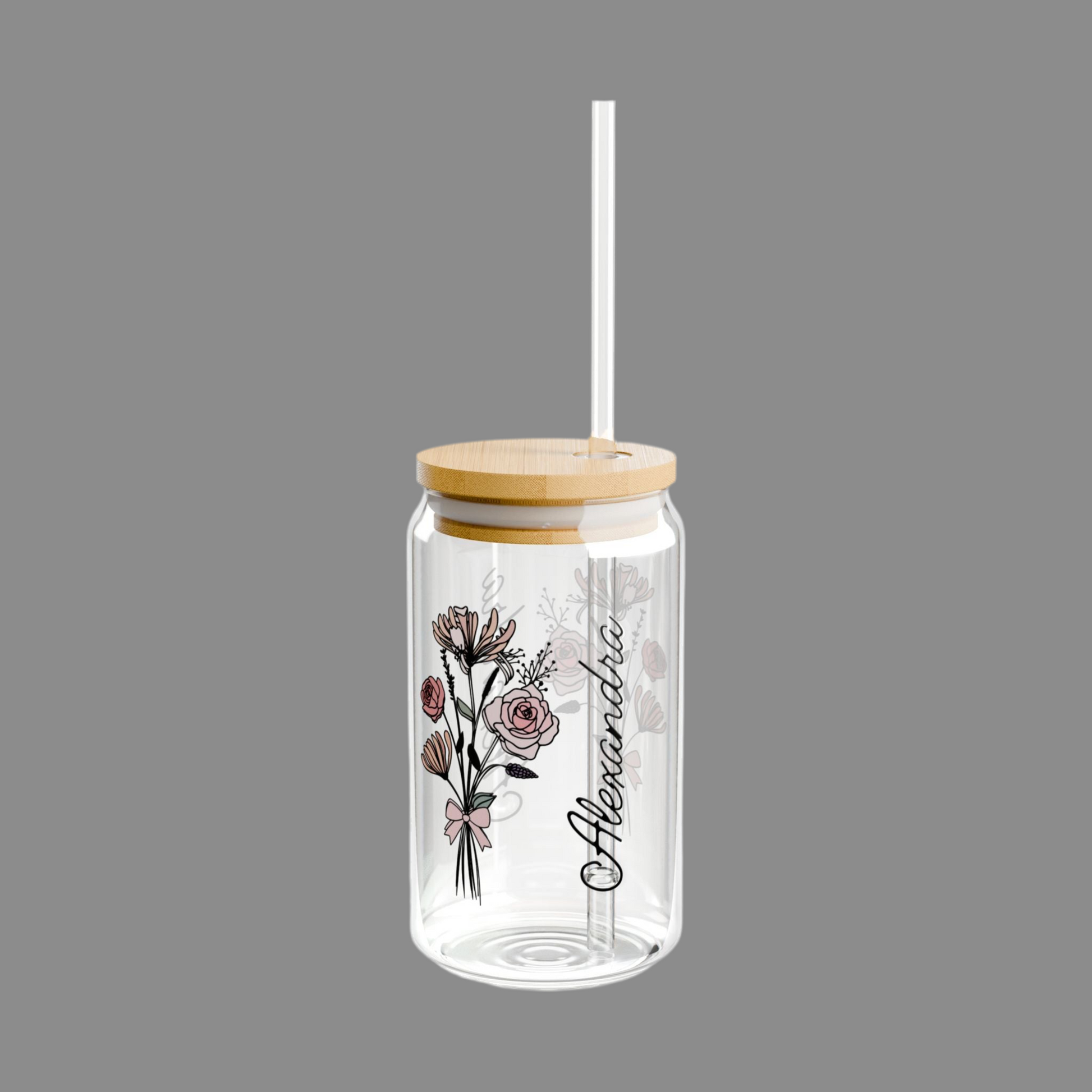 Celebrate your unique style and birth month with this Personalized 16oz Can Glass, featuring a beautifully illustrated flower for your birth month and a custom name for a personal touch. Perfect for sipping iced coffee, tea, or your favorite beverage, this glass combines elegance with functionality.